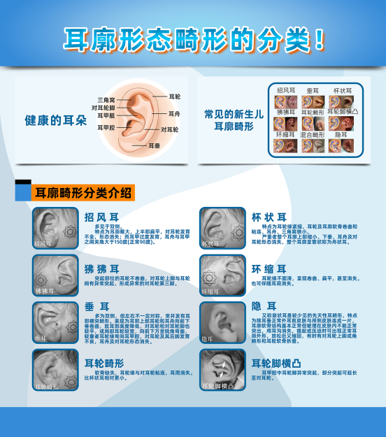 生活中,我們也常??吹?-9歲甚至是成人都有招風耳,然而,招風耳并未招來財運和福氣,還往往讓女性披頭散發(fā)遮掩。因為確實拉低顏值。 誤區(qū)二 這一傳言自古有之,但是絕大多數(shù)人捋捋并無效果。因此,很多人痛悔一生,就像小研媽媽。 常見的耳廓畸形通常有九種:招風耳、狒狒耳、垂耳、耳輪畸形、杯狀耳、環(huán)縮耳、隱耳、耳輪腳橫凸、混合畸形。(如下圖)